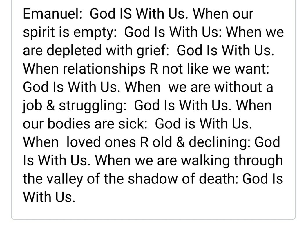 No Matter What: God Is December 24, 2020 Alfred McGowen GOD IS WITH US Because God Wants To Be With You, Let Go & Let God. Be In Control! You Will Be Glad You Did. SoJourner Share this: Click to share on X (Opens in new window) X Click to share on Facebook (Opens in new window) Facebook Like Loading... Related Published by Alfred McGowen I am a Christ-Follower who offers Foundational Life Changing Truth that can help a person find R.E.S.T. Or Rock-solid Eternal Spirituality Today View all posts by Alfred McGowen